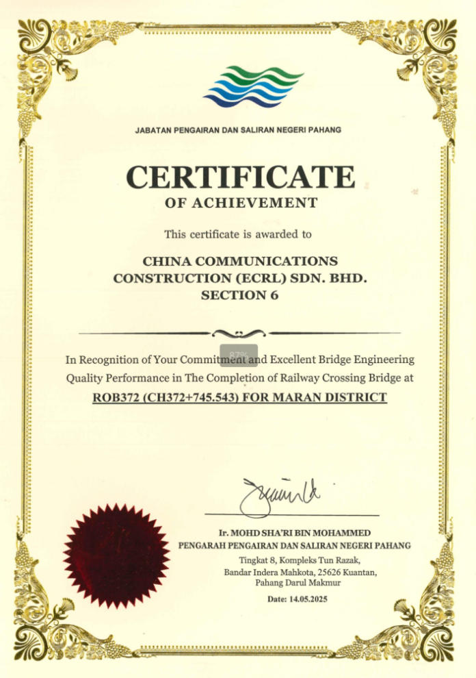 中交马东铁六分部荣获彭亨州水利灌溉局颁发“优秀桥梁工程质量奖”