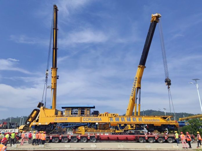 10月30日,随着铺轨机主机平稳落入轨道,中交马东铁项目十分部铺轨机组第四次调头工作在关丹铺轨基地顺利完成。截止目前,十分部已完成起点站哥打巴鲁站至云顶隧入口道约491公里正线的长轨直铺任。本次调头是为了灵活应对现场移交进度,以启动居茶支线和关丹港支线的轨道铺设。