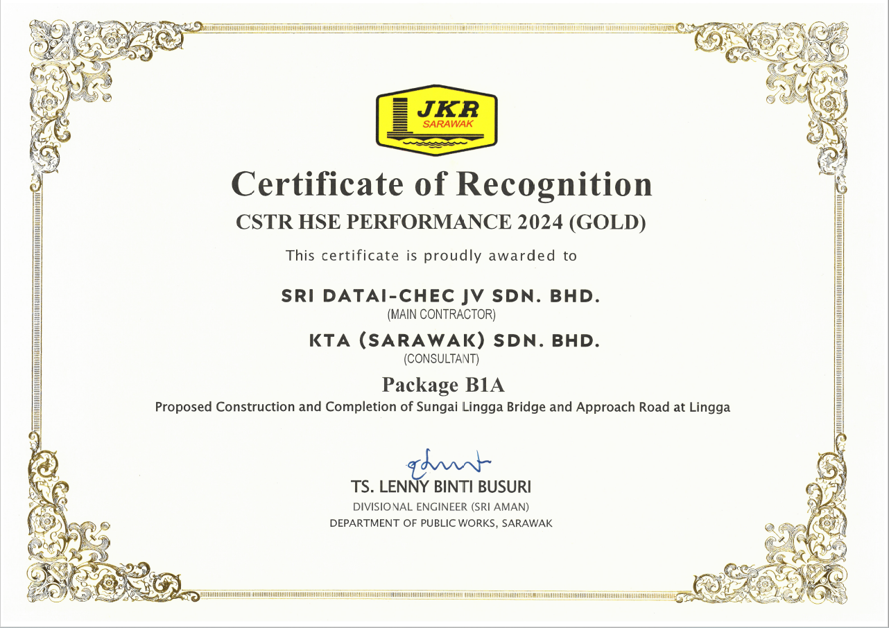 8月20日,在马来西亚砂拉越州斯里阿曼公共工程局(JKR)举办的职业健康安全和环境颁奖仪式上,由中国港湾承建的林牙河大桥项目荣获2024年度健康、安全与环境绩效金奖,体现了项目团队在海外工程建设中优异的QHSE管理能力。
