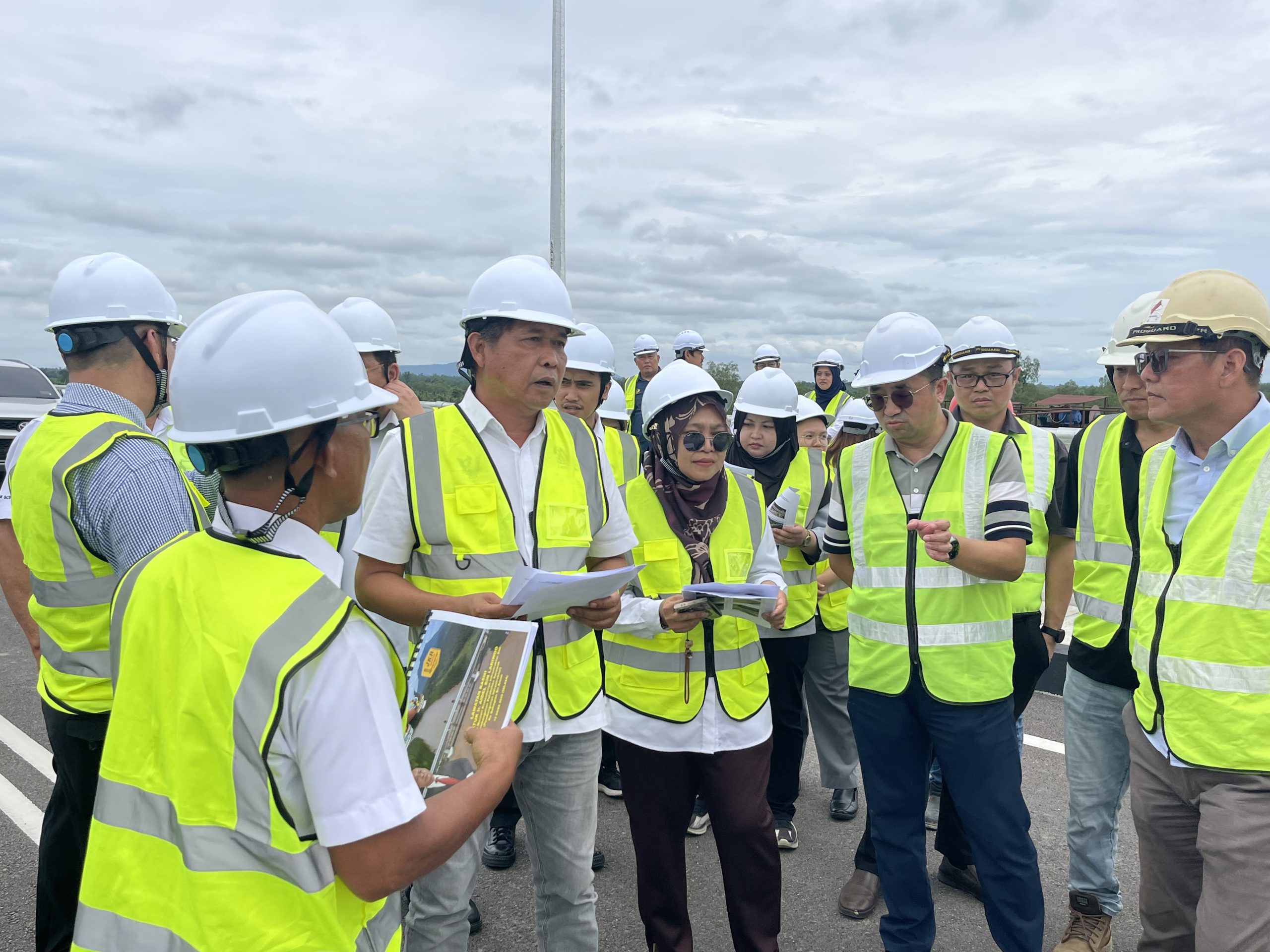 现场,Aidel Lariwoo听取了项目业主代表和承包商的详细汇报,深入了解工程整体推进情况、质量管控措施以及施工过程中所面临的技术挑战。他高度赞赏项目团队克服当地不利气候条件和施工资源紧缺等多重困难的努力,充分肯定承包商采用的高效、环保且在当地具有开创意义的路基水袋堆载施工方案。Aidel Lariwoo强调,B1 及 B1a 项目是沙捞越沿海第二干道交通圈的重要组成部分,对沿线居民出行、区域经济发展及物流运输具有深远意义。希望项目严格执行质量安全环保相关标准,建设优质工程,为沙捞越沿海地区发展注入新的动力。