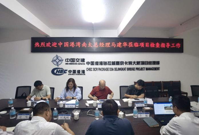 在塞京卡特大桥项目,马建华一行实地调研施工现场,听取了项目相关负责人对项目情况的汇报,马建华对下阶段工作提出要求:一是加强二次经营,立足业主方需求统筹考量,制定兼顾双方利益的综合解决方案,推动工作落地见效,切实提升项目经济效益。二是严守工期节点,筑牢履约根基。强化各工序衔接配合,持续提升施工效率,精准管控施工全流程,确保各节点任务按时保质完成。三是优化视觉形象,加强成本管理。优化大桥设施视觉形象设计,着力提升项目整体形象,强化成本管控,提升项目效益。四是强化协同联动,提升工作效能。对内加强内部协同,形成工作合力;对外加强与业主、合作方的沟通协调。五是深化复盘总结,深耕市场拓展。加强经验总结,为后续同类项目提供可复制、可推广经验;依托塞京卡特大桥项目优质履约,树立良好品牌口碑,深耕东马地区市场。六是强化内控管理,做好人员规划。结合项目施工进度,科学统筹团队人员调配工作,同时维护好各方合作关系,保障业务衔接顺畅。